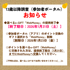 13歳以降調査でご登録いただく参加者ポータルサイト(アプリ)より、1月16日付で下記の通りポイント交換に関するお知らせがありました。